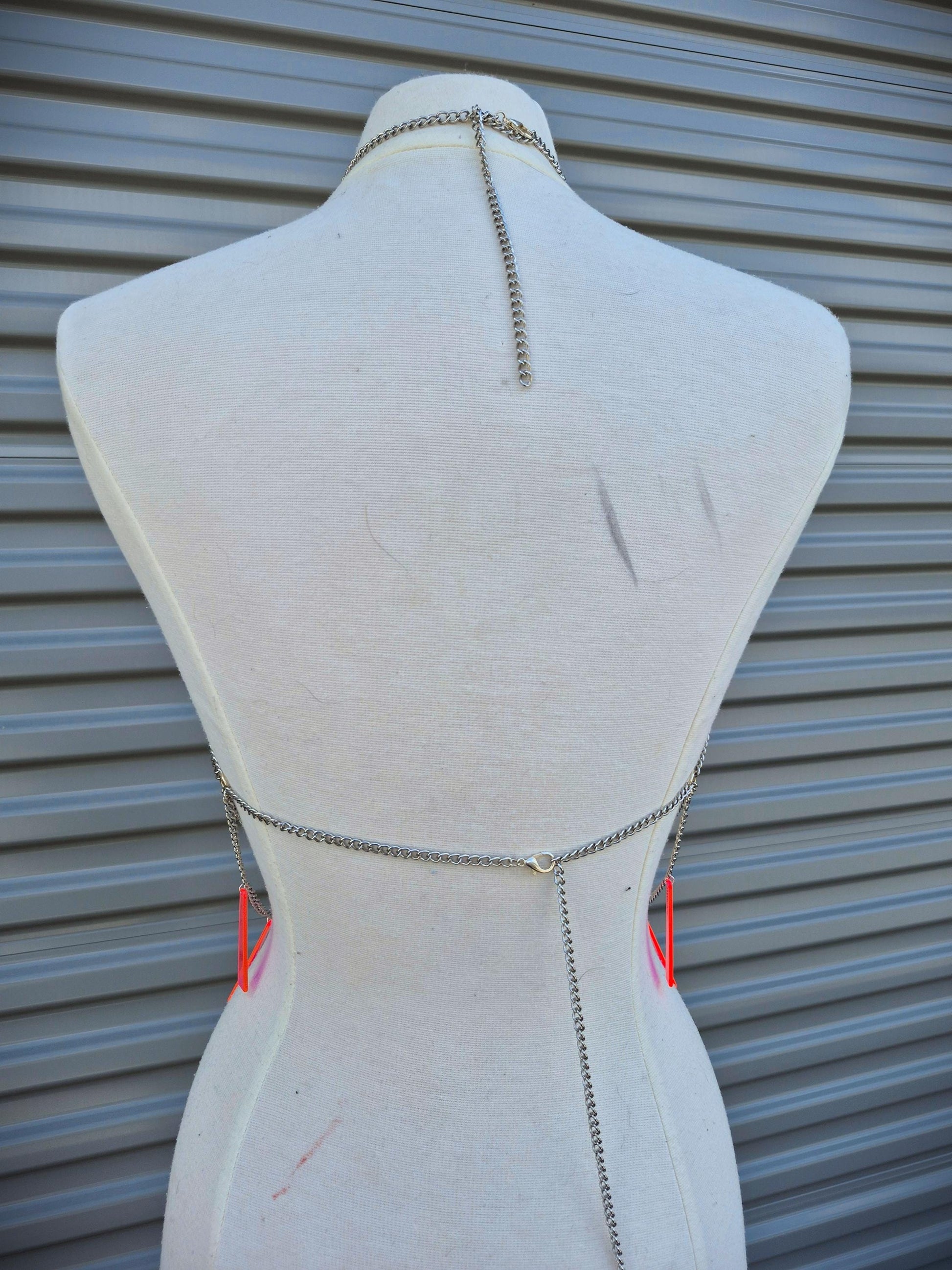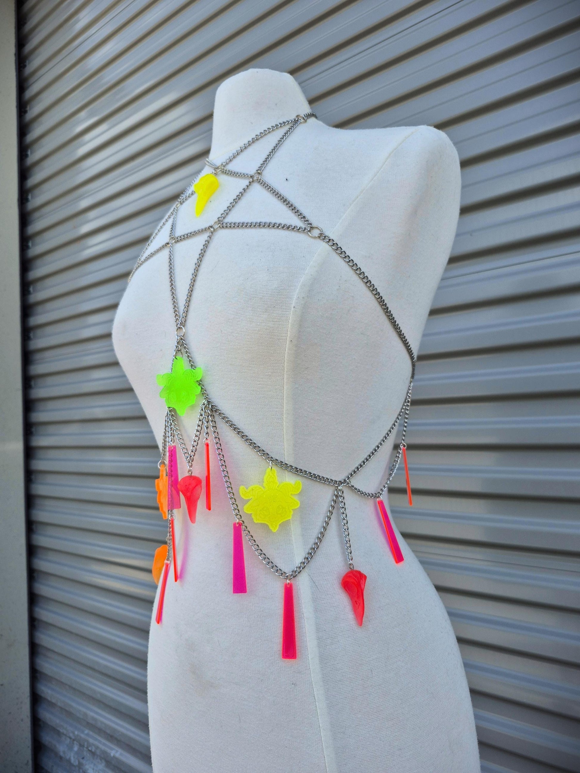 This item is currently made to fit a size Small-X-Large, but if you would like a larger size I can transfer the elements to a body chain size of your choosing. The following item was done in collaboration with Artsythingsboutique (Find them on Instagram!)