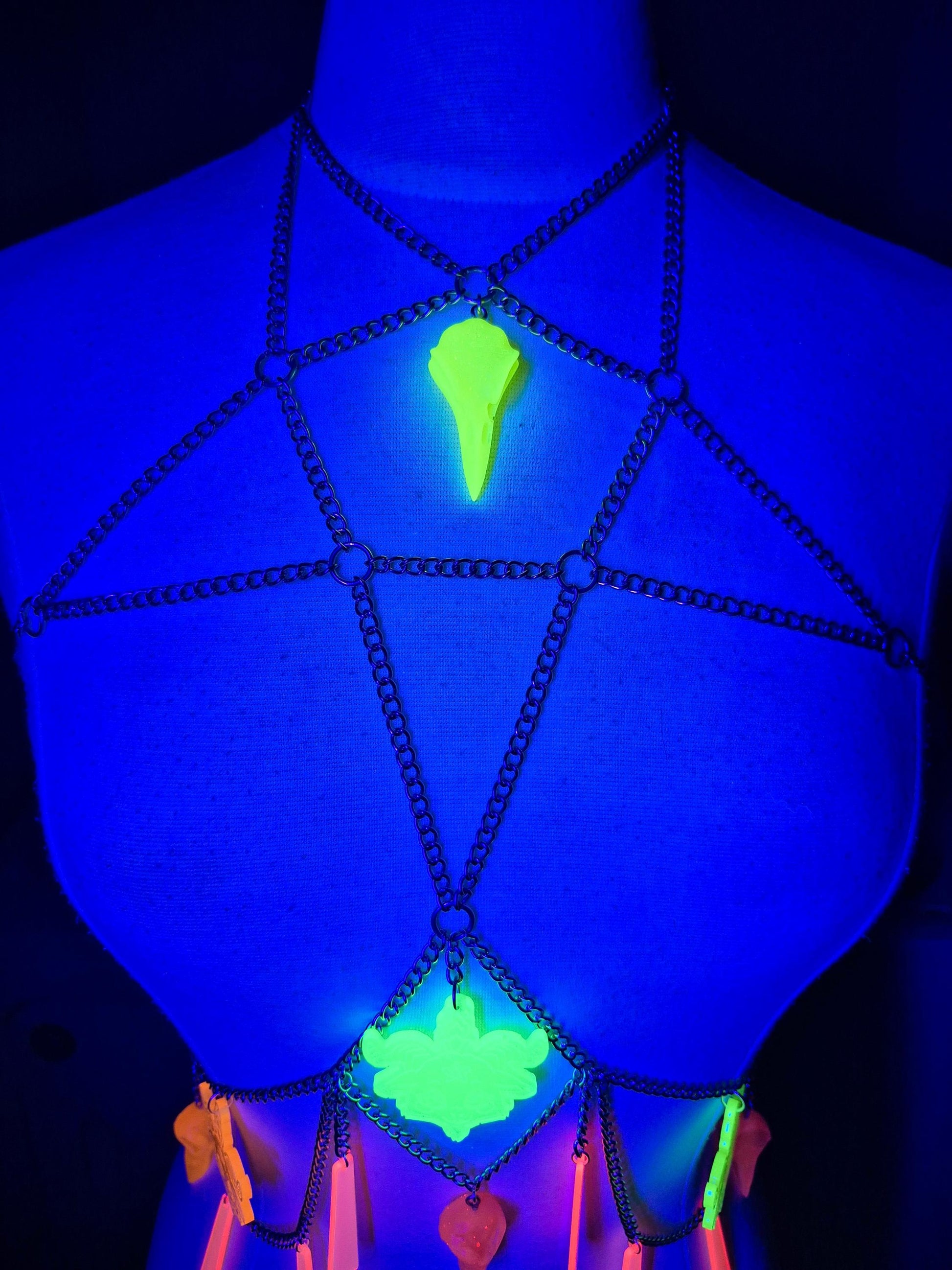 Adjustable Blacklight Reactive Pentagram Goat Head Raven Witchy Body Chain 90's Style