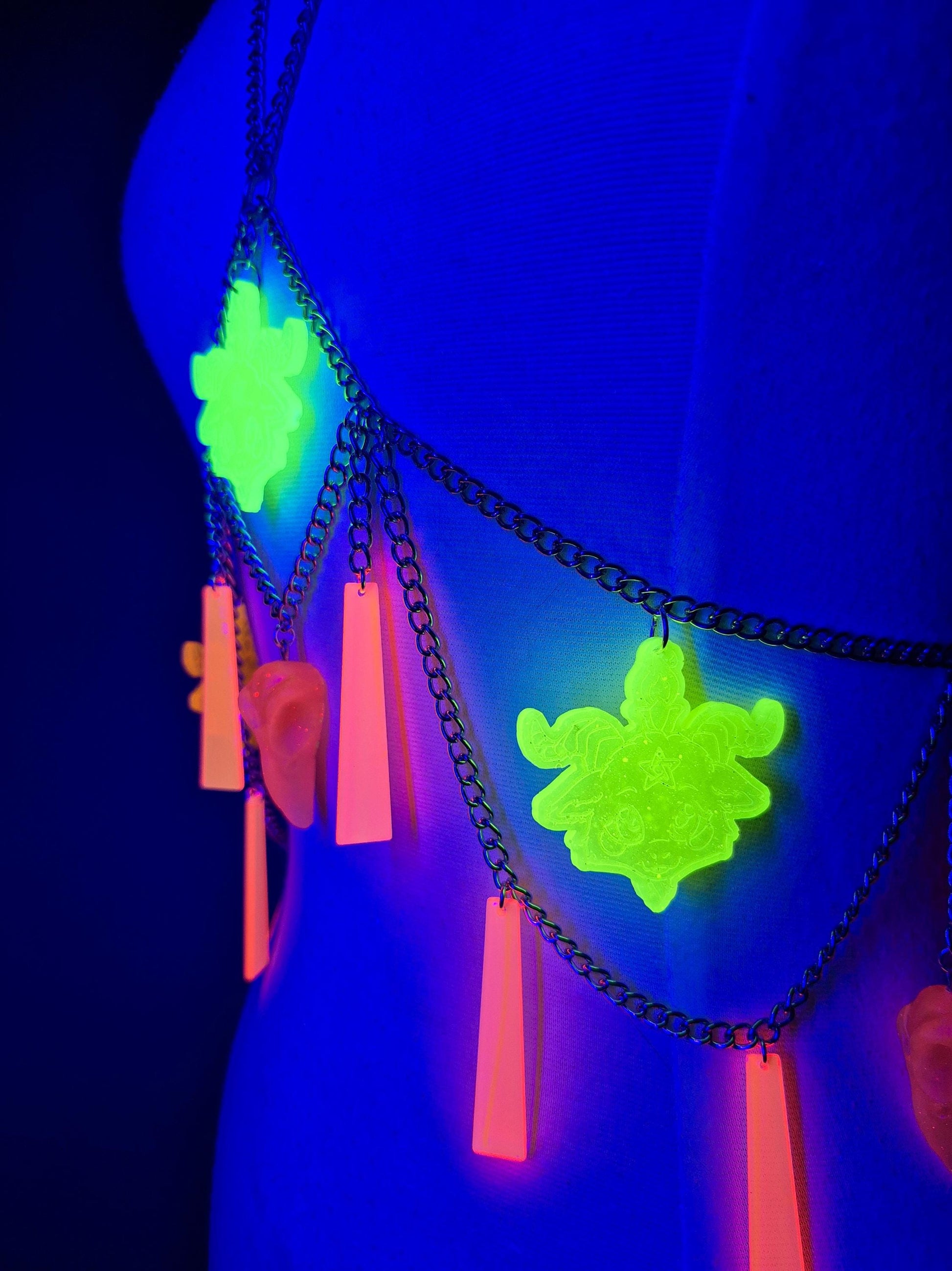 It was made using silver colored chains, U/V reactive resin charms, and real silver jump rings for extra durability. The chain secures with a lobster claw style clasp behind the neck and back. All chains include a 1 year repair warranty.