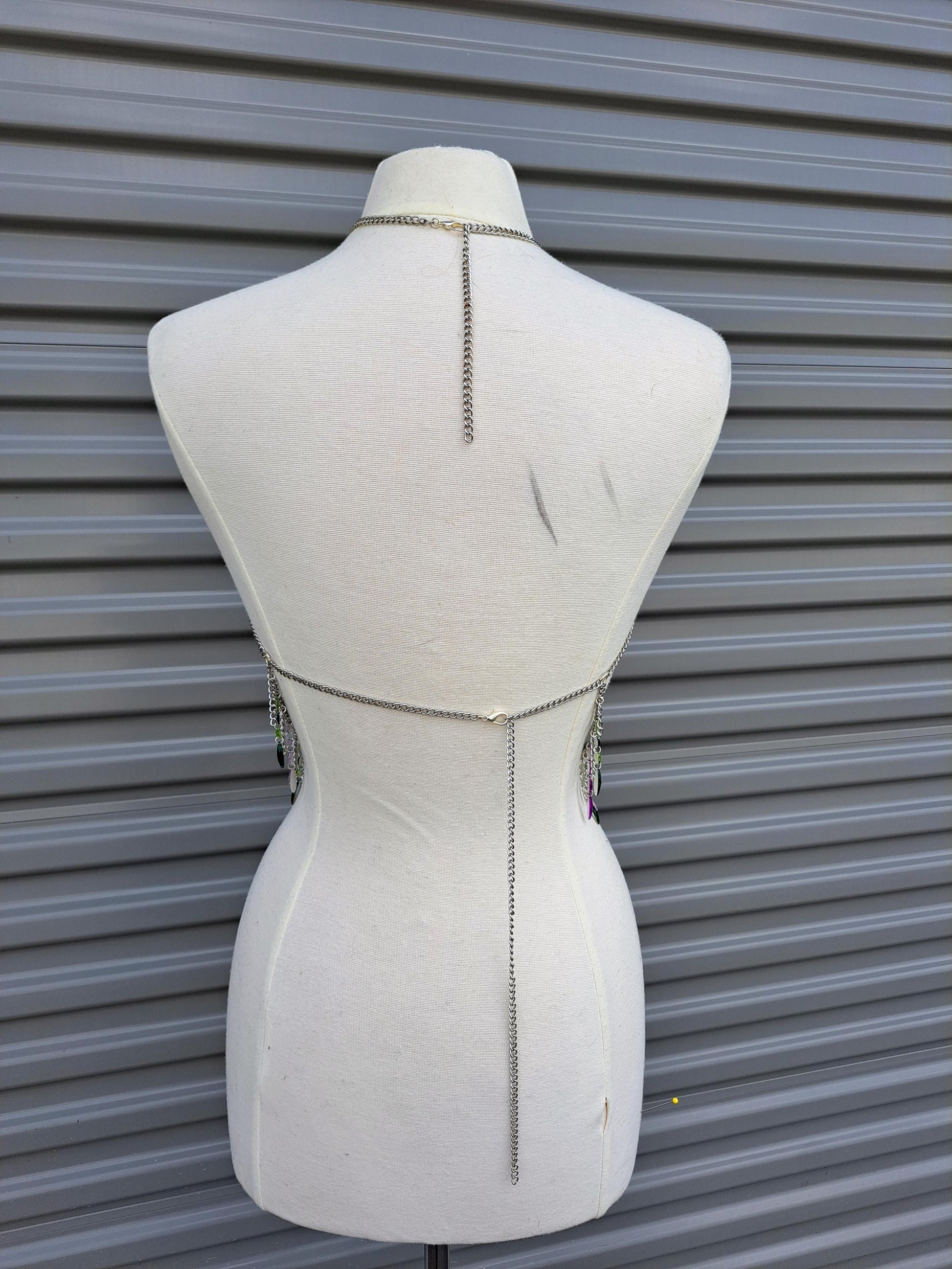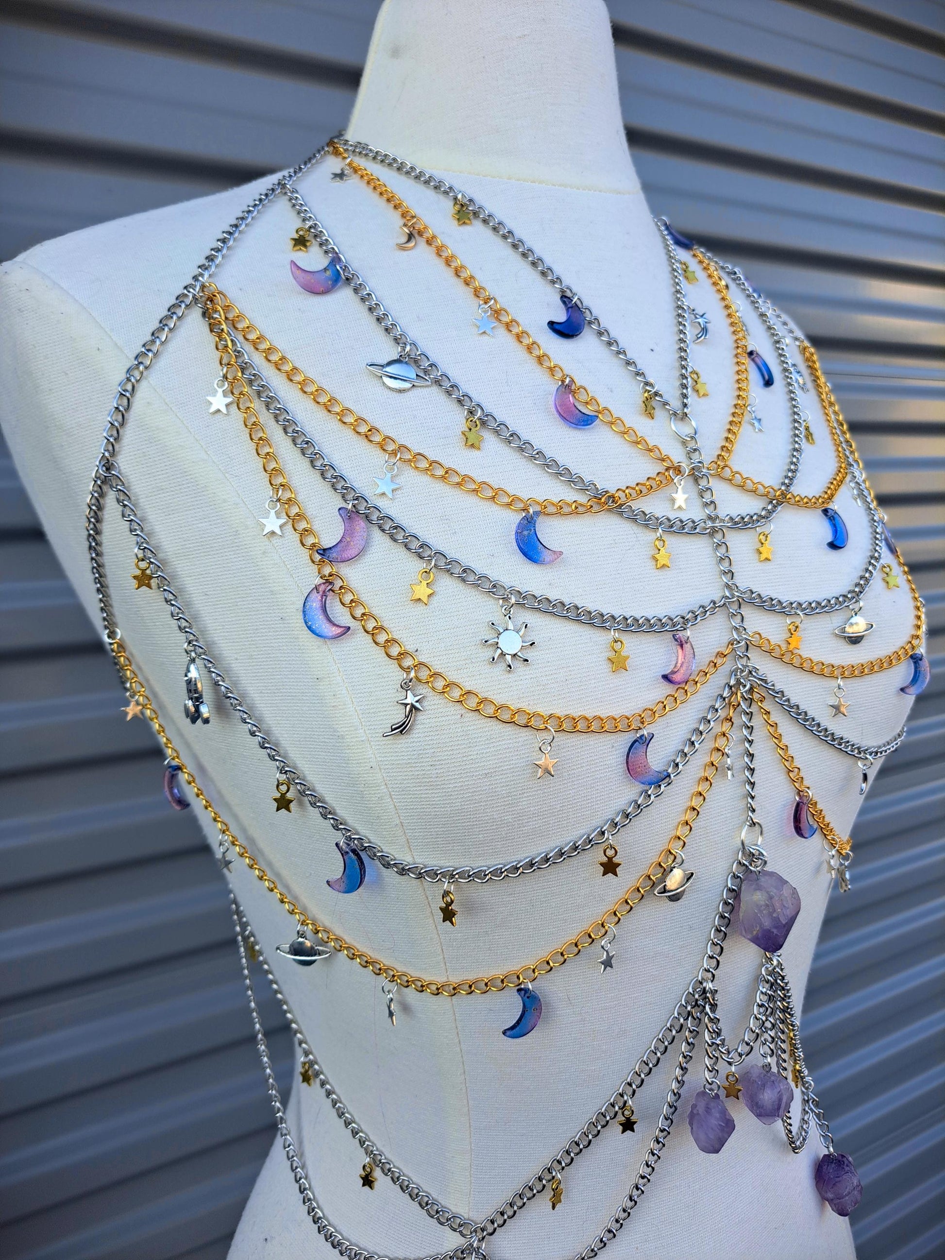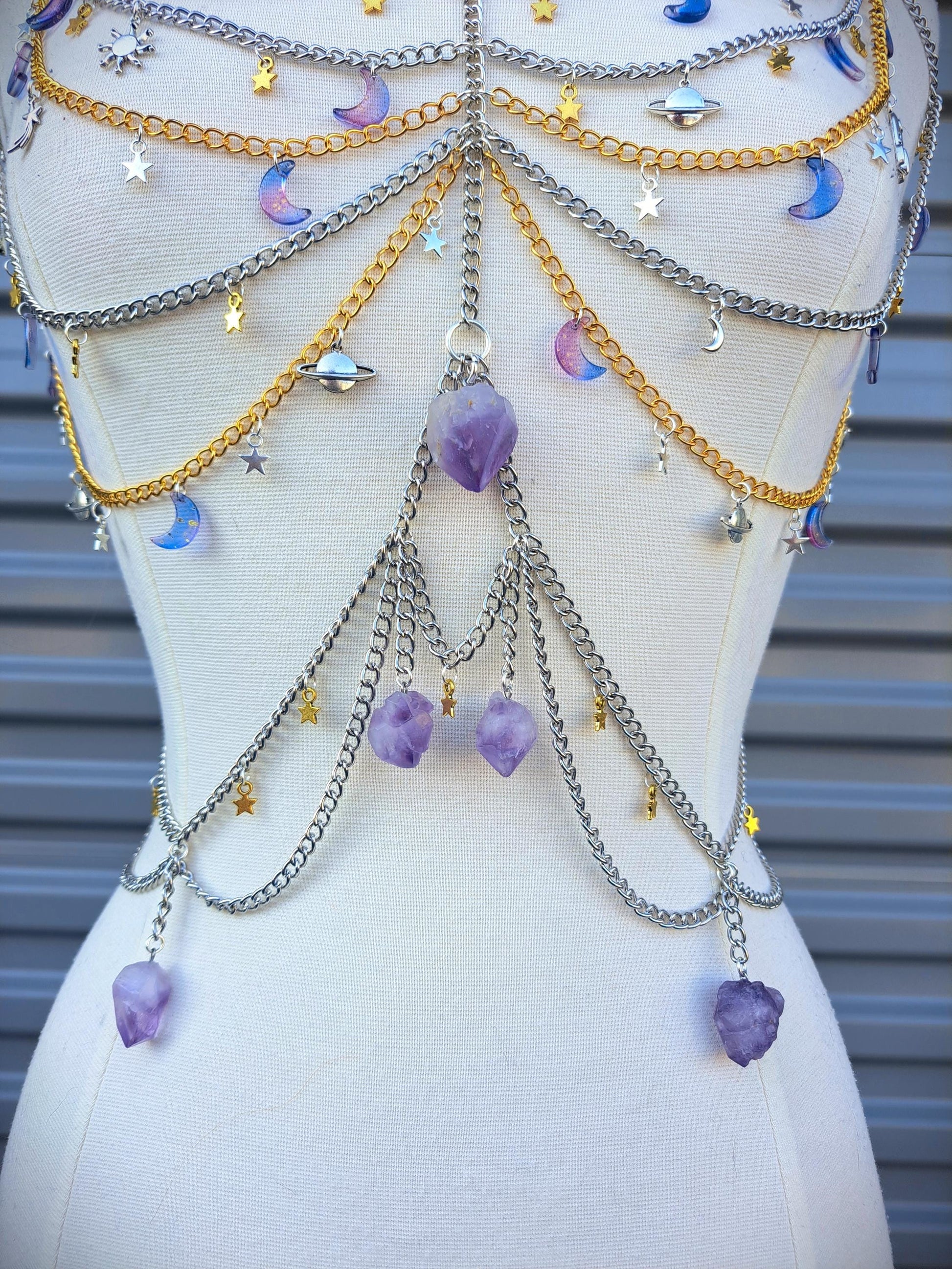 This is a custom made-to-order piece and can take 3-6 weeks to complete! It is a size inclusive item, you must state your desired size upon purchase. I can make alterations to the design, just ask! This piece is made with silver and gold colored chains, glass moons, and real amethyst chunks. All of the charms are attached with real silver jump rings for extra durability, and the chain secures with 2 lobster claw style clasps in the back. All body chains include a 1 year repair warranty.
