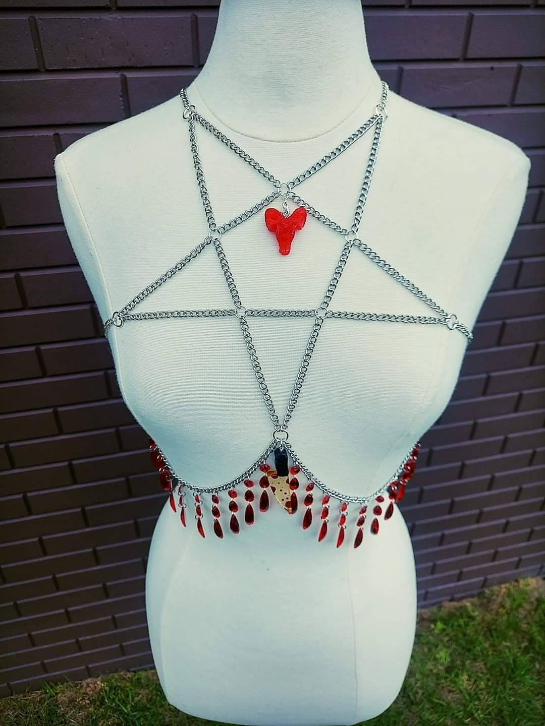 This witchy pentagram body chain can be made in multiple styles and any size. It is made with silver colored chains that are attached with real silver jump rings. The chain closes behind the neck and back with a lobster claw style clasp. This item will be adjustable up to 3 sizes. After your purchase I will message you to discuss how you would like to customize your chain and show you all the charms/ gems I have available to use. I can also remake any of the previous styles upon request, or make one that fits the theme of your choosing. THIS LISTING DOES NOT INCLUDE UV REACTIVE CHARMS OR GEMS! Please message me directly if you are wanting a custom UV/ Blacklight reactive pentagram body chain. To see more pentagram chain examples please visit my intsagram @Phantasmagirl